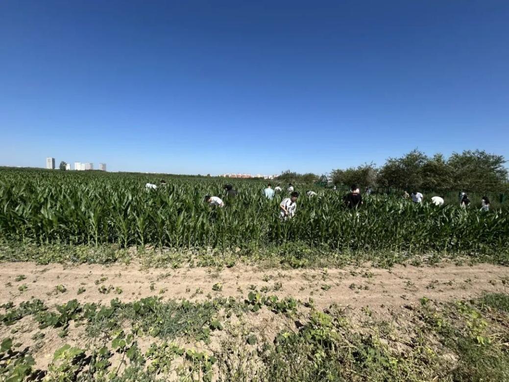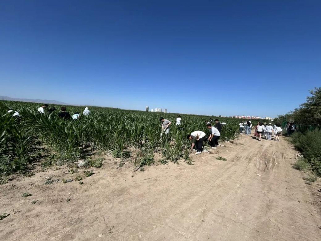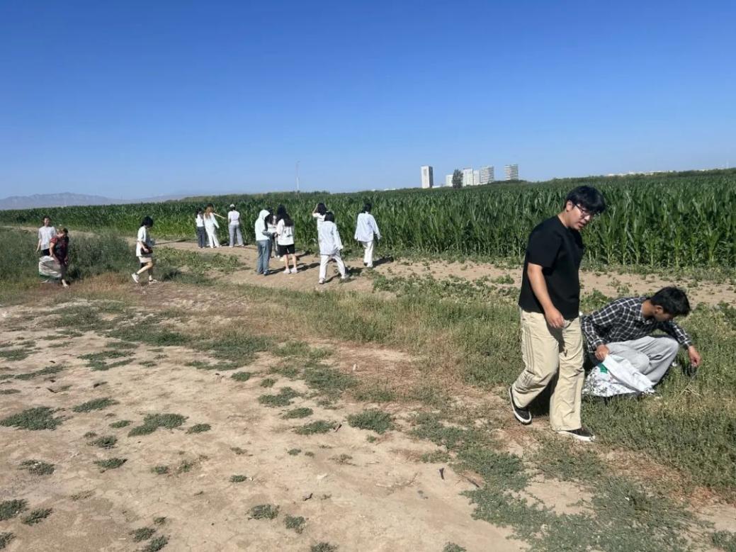 清理结束后,同学们深入农田开展作物生态观察。在麦麦提老师指导下,大家测量玉米株高、叶面积等生长指标,并参与田间除草实践。“亲手触摸土壤、观察作物生长,让《环境学概论》课上的理论知识瞬间‘活’了起来。” 学生王俞文感慨道,劳动实践让他真切体会到农业生产与环境保护的辩证关系。