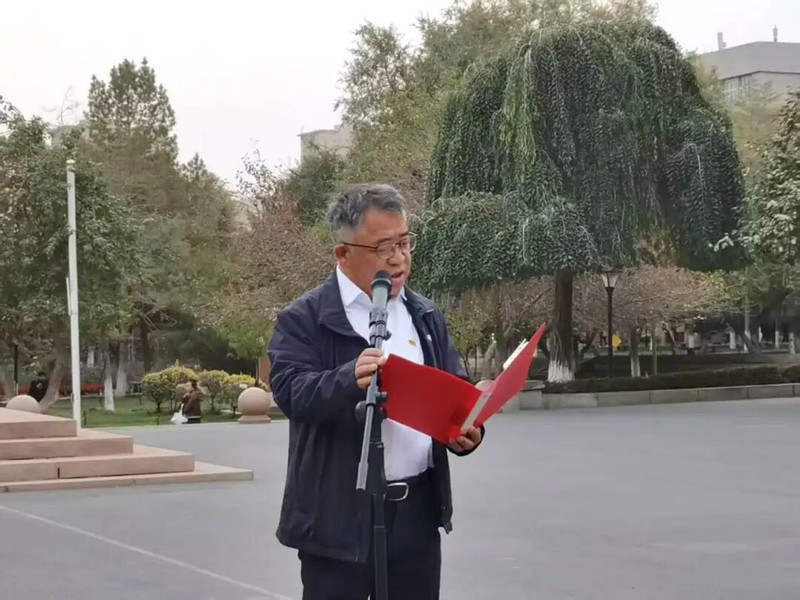 教师代表郭亮老师感慨:“新疆 70 年,是与祖国同呼吸、共命运的 70 年!”他寄语同学们勤学笃行练本领、勇于创新践使命,像石榴籽般团结互助,让民族团结之花绽满校园。